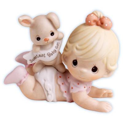 Isn't she adorable? This little baby girl is giving a little bunny rabbit a ride on her back. The rabbit is proudly holding a banner the says Sweetest Baby Girl. This figurine is a perfect gift for a new baby girl.